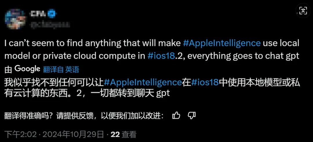 Apple苹果 10月28日,Intelligence可能真的不太好,Apple 在美国等一些国家,Intelligence上线了。但是客户体验之后纷纷给出差评,主要原因可以概括为:Apple Intelligence就是套壳GPT,顾客提出的所有需求都会跳转到GPT。