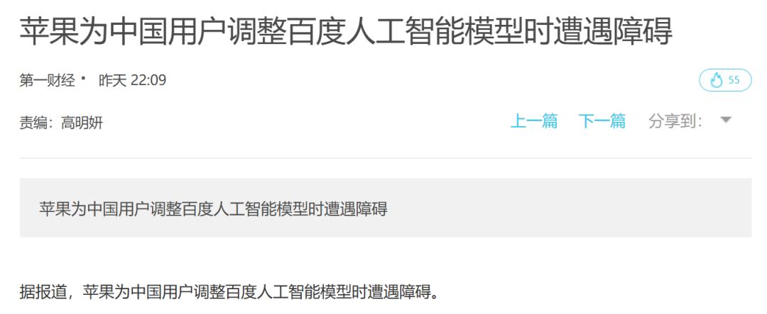 昨天晚上,第一财经报道了一条新闻, 据悉,苹果在为中国客户调整百度人工智能模型时遇到了阻碍。
