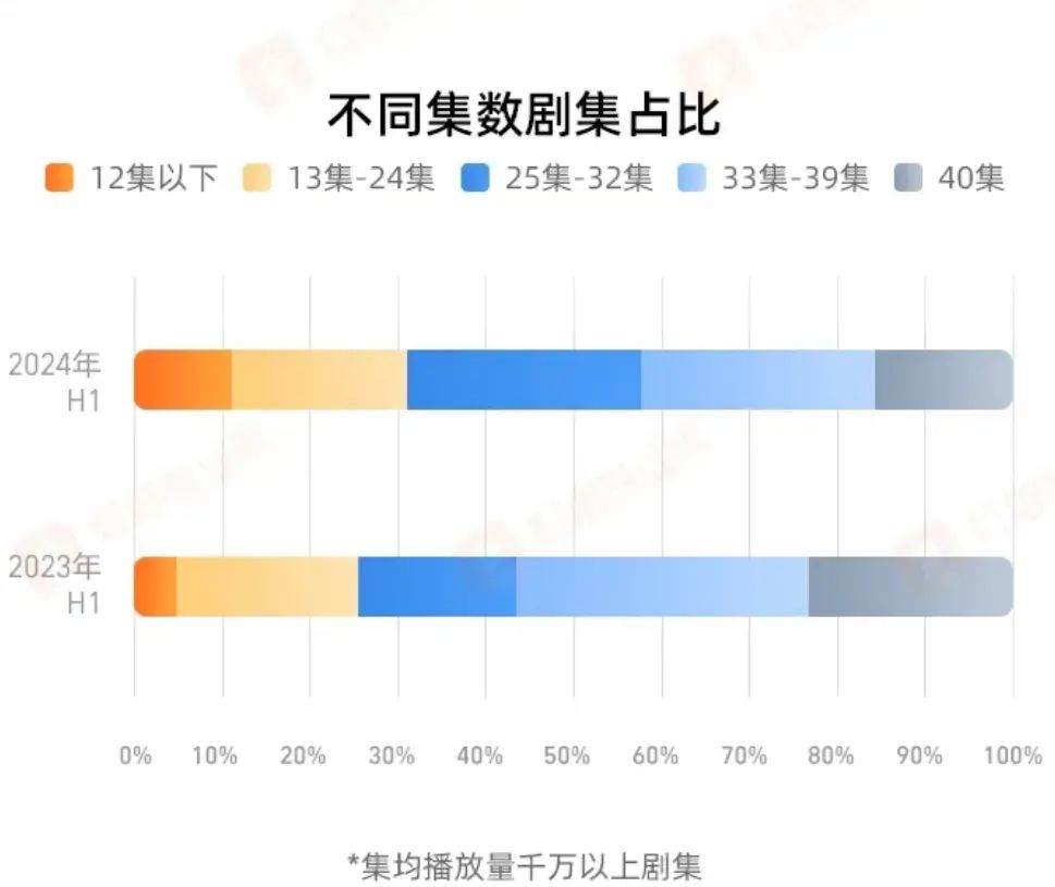 在慢慢收紧的标准和市场反馈下,从2023年上半年到2024年上半年,我们可以清楚地看到电视剧缩短的趋势。33-40集的剧集减少,32集及以下的剧集整体增加,说明长剧已经逐渐超过了40集的门槛,进一步压缩了剧集。