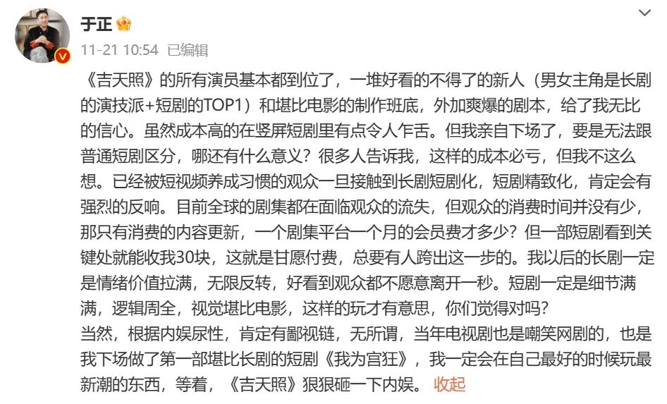 作为《墨雨云》的制片人,于正前不久还提到了“长剧短剧化,短剧精致化”,顺便为自己策划的短剧《吉天照》创造了动力。于正认为,未来的长剧应该是“情感价值满满,无限反转”,《墨雨云》可以说是一个实验场,而短剧“细节满满,逻辑全面,视觉堪比电影”意味着成本必然上升。