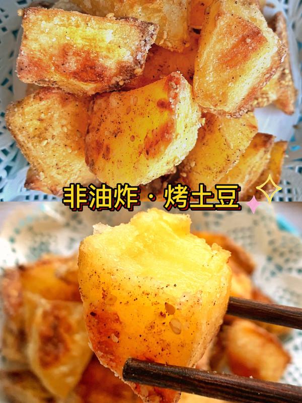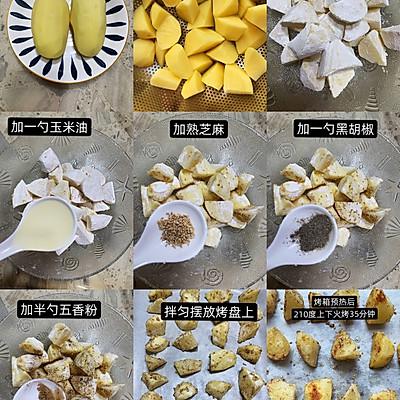 1、步骤✅ 1️⃣土豆去皮洗净,切成滚刀块,过水后沥干,放入盆中撒上淀粉。 2️⃣加入一勺食用油,一勺黑胡椒,一勺熟芝麻,一勺五香粉拌匀。 3️⃣烤箱预热后,210 度上下火烧 35 分钟