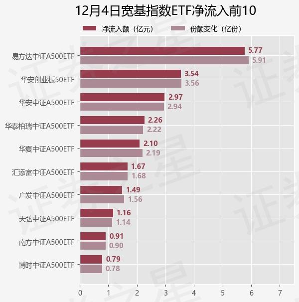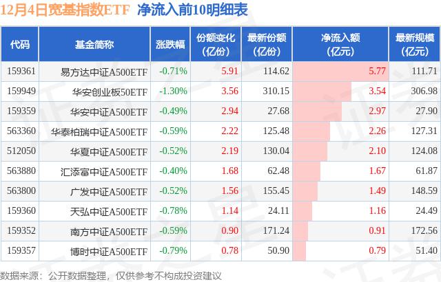 证券之星消息,12 月 4 日宽基指数 ETF 总资金净流出基金 52.78 亿元,近 5 一个交易日累计净流入 153.18 亿元,5 在一个交易日内,出现了日合计资金净流入。 1 天(ETF 计算资金流入的方法:(当日 ETF 现场流通份额 - 前一交易日 ETF 现场流通份额)* 当天 ETF 均价,数字仅供参考)。