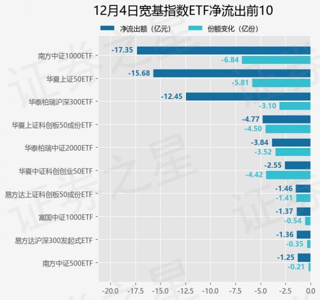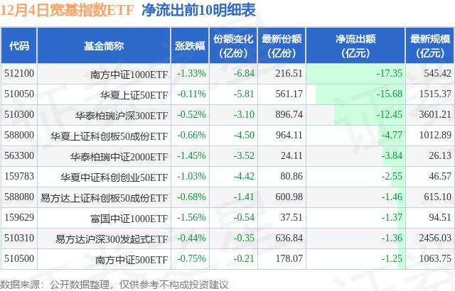 当天有 93 只宽基指数 ETF 资金净流出出现在基金中,其中净流出排名第一的是南方中证 1000ETF(512100)减少了份额 6.84 一亿份,净流出额为 17.35 亿元。