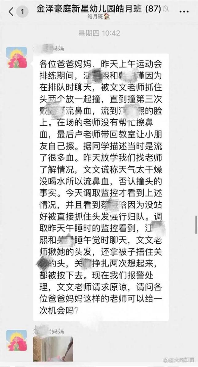 群聊名为“金泽豪庭新星幼儿园皓月班”,父母在群里发言称,两个孩子在运动会排练期间互相发言,被一个老师抓住,两个孩子的头互相碰撞。其中一个孩子流鼻血。“昨天放学后,我们让涉案老师核实情况。她假装天气干燥,没有喝水,所以流鼻血,否认伤害孩子。今天,我们收集监控,看到真实情况。”