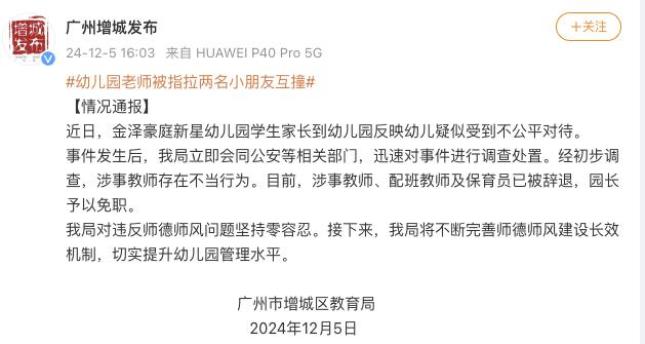 12月5日上午,记者联系广州市增城区教育局,工作人员表示已经关注此事,正在收到上级文件加紧处理。