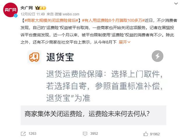 最近,不少网友发帖称,自己的“运费保险”权益被平台取消,并有媒体报道有人使用运费保险。 8 个月骗到了 100 如今,商家已经开始大规模关闭这项服务。