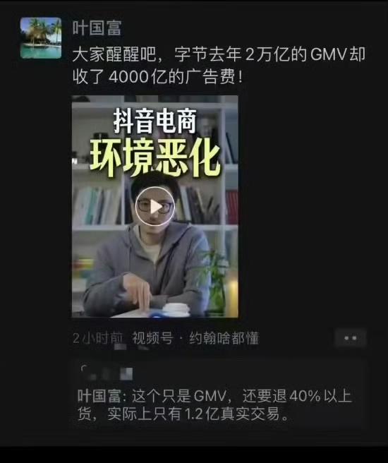 这个视频对应了叶国富一开始转发的视频,据该视频博主透露,去年字节跳动凭借 4000 亿元的广告收入,在国内互联网大佬中排名第一,远超阿里巴巴、拼多多、腾讯、JD.COM等龙头企业。但是,像抖音电商这样的广告收入,却是建立在基础上的。 2 万亿 GMV 基础上的。相比之下,阿里巴巴的电子商务 GMV 高达 7.7 一万亿,是抖音电商的几倍。
