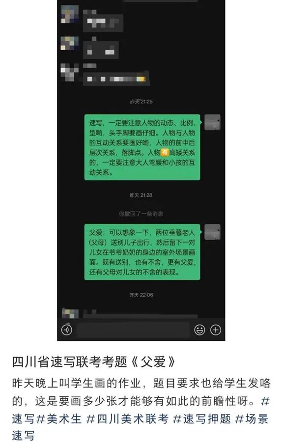 根据网友曝光的微信群聊截图,疑似工作室的老师在考试前一天通知学生:“今晚的素描题目是《父爱》,大家都认真画,明天的考题,内部消息。”另外一张聊天截图显示,老师正在指导父爱题材的素描。此外,老师还发了一张图片。他举着一张“美术专业模拟联考”的素描试卷,说:“马上就是最后一次考试了。预测四川省今年的素描试题《关于父爱》。”