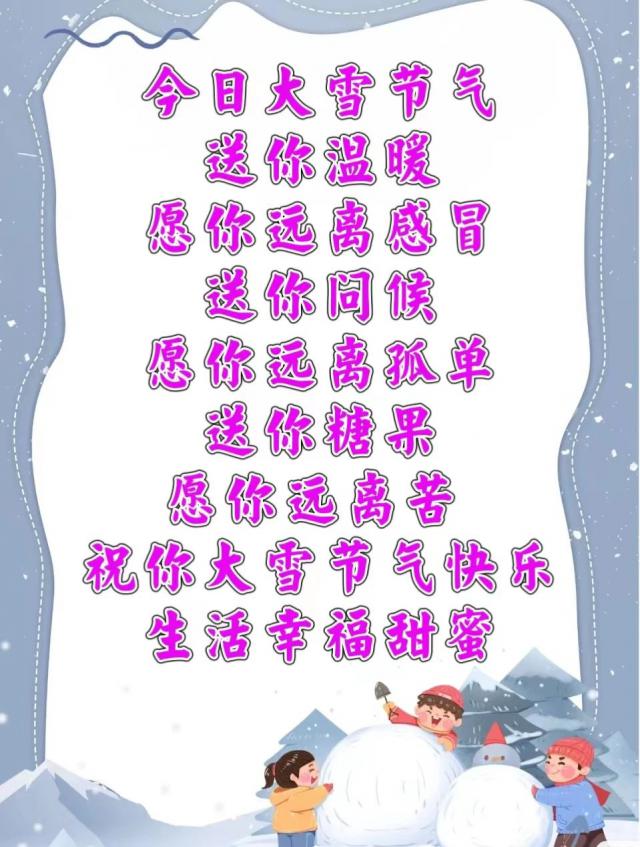 大雪节气寒冷,祝福温暖的阳光:“安全”做你的雪地靴,“如意”做你的厚棉袄,“幸福”做你的暖裤,“幸福”做你的棉帽。愿整个冬天温暖!