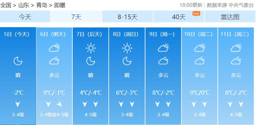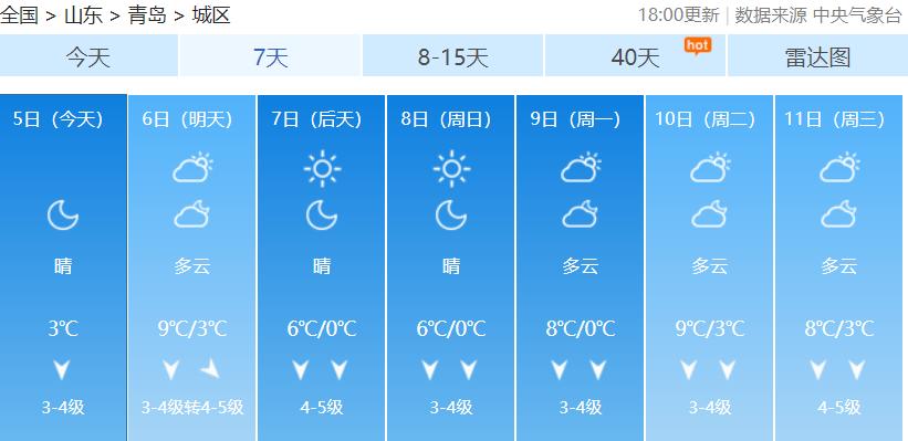 [青岛城区]今日白天,晴转多云,北风3-4级,相对湿度30%~75%。今日最低温度为3℃,最高温度为9℃。