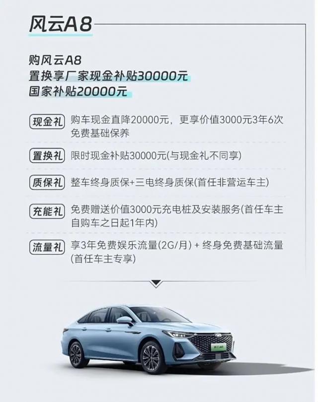 其中选购风云 更换A8(非远航版)可享受厂家现金补贴 3 一万元,政府补贴 2 万元,如果不参与更换,可以直接享受。 2 一万元现金折扣。风云 A8 凌风版 11.99 从1万元的价格来看,即使没有置换补贴,价格也可以降到最低。 9.99 一万元起,艾瑞泽的价格和燃油版 8 接近。