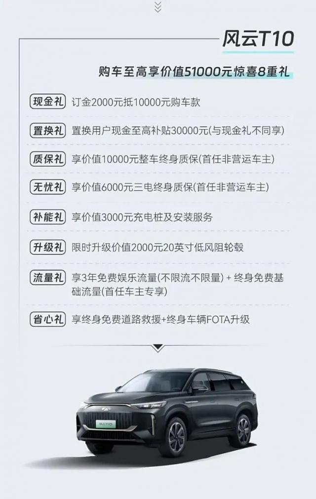 另外,购买风云 T9 可以享受最高价值 3.1 综合优惠1万元,包括更换最高补贴 1.5 购买风云万元; T10 可以享受最高价值 5.1 综合优惠1万元,可选择定金 2000 元抵 10000 购买车款,或更换最高补贴 3 万元。