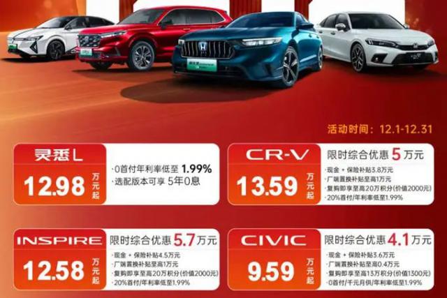 除思域外,购买 CR-V 车型,可以享受限时售价 13.59 万元起;选购英仕派车型,可以享受限时售价 12.58 万元起,目前东风本田旗下车型的价格仍然十分诱人。