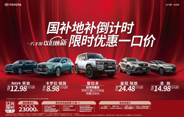 在 12 月份,一汽丰田推出限时购车政策,其中一个限时价格涉及限时购车。 RAV4 荣放,卡罗拉锐放,普拉多,皇冠陆放,凌放, HARRIER 模型。其中选购 RAV4 荣放 2.0L CVT 两驱都市版可享受限时一口价格。 12.98 万元(2.0L CVT 两轮驱动都市版指导价 16.98 万元)。