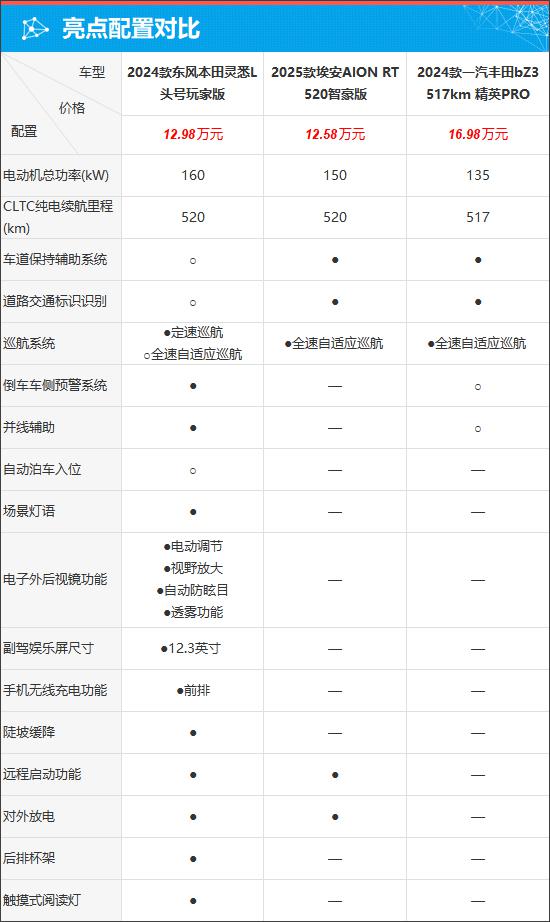 价格上,2025 款埃安 AION RT(以下简称:埃安 AION RT)厂家参考价格低至 12 不到一万元,是三款中最低的;顶配价格最贵的是 2024 款一汽丰田 以下简称bZ3:丰田 BZ3),达到 19.98 万元。就车型数量而言,埃安 AION RT 提供 5 汽车供消费者选择,数量十分丰富。一汽丰田 bZ3 还不错,共有 3 款车可选。2024 东风本田灵悉 L(以下简称:灵悉 L)尽管仅提供 1 一辆车,但是提供了两个选择包,客户可以根据自己的需要进行选择。