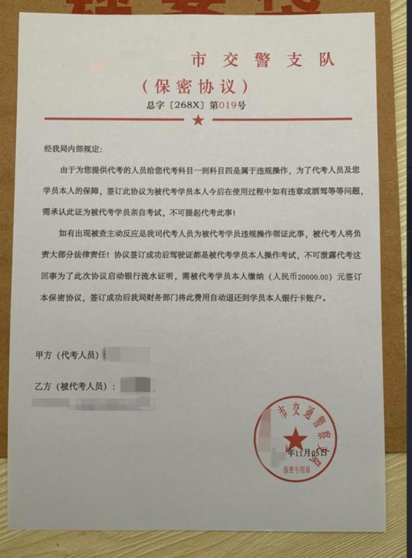 4. 然后,他们假称下证成功,并给用户一张名为“xx省车辆管理所内部机密考试协议”的红头文件照片,要求用户支付2-3万元的机密费,并声称车辆管理所财务部门在签署成功后会自动退还。付款期间,当客户收到微信客户端的风险提示时,“教练”会督促他们忽略提醒,继续付款。