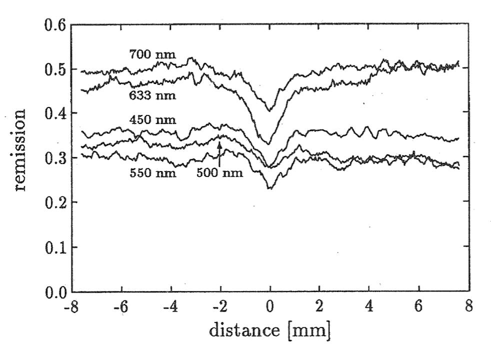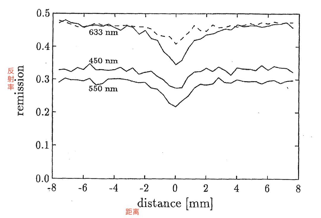 图一 模拟短波长(450 nm,蓝光)、中波长(550 nm,绿色光)和长波长(633 nm,红光)穿过皮肤后从静脉区反射的强度变化