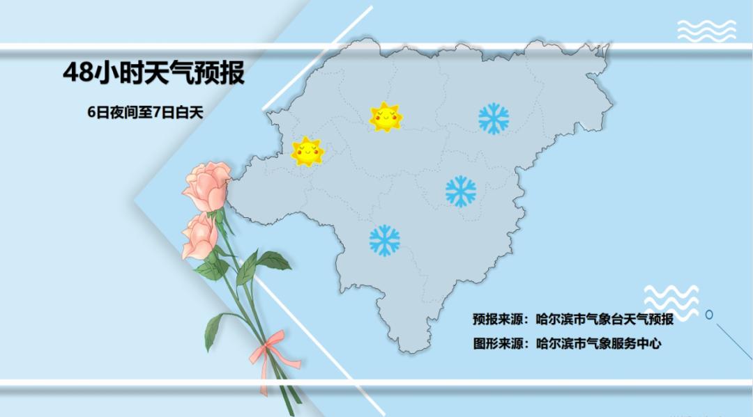 5日晚至6日白天:5日晚,全市阴天有小雪。6日白天,东部地区阴天有雪(通河、方正、延寿、尚志、依兰、五常),其他地区阴天;西风3~4级,阵风5~6级;东部和北部最低温度-22~-20℃,其它区域-19℃~-16℃,最高温度-13℃~-11℃。
