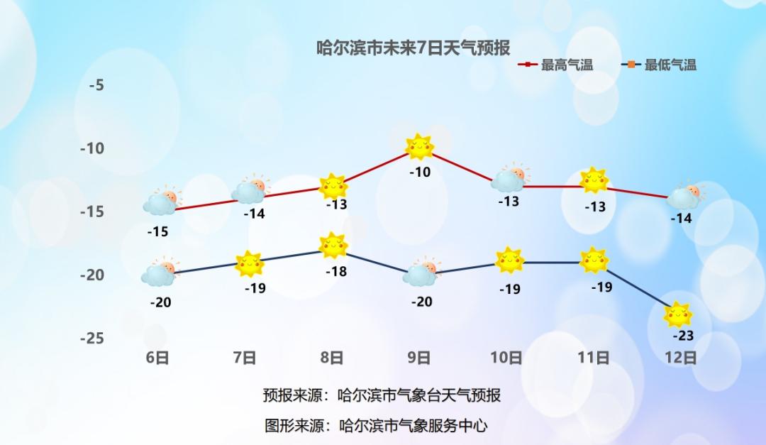 6日白天最高气温:大兴安岭,黑河,伊春,齐齐哈尔北部,绥化,哈尔滨,佳木斯,鸡西-15~-13℃,其他地区-11℃~-9℃。