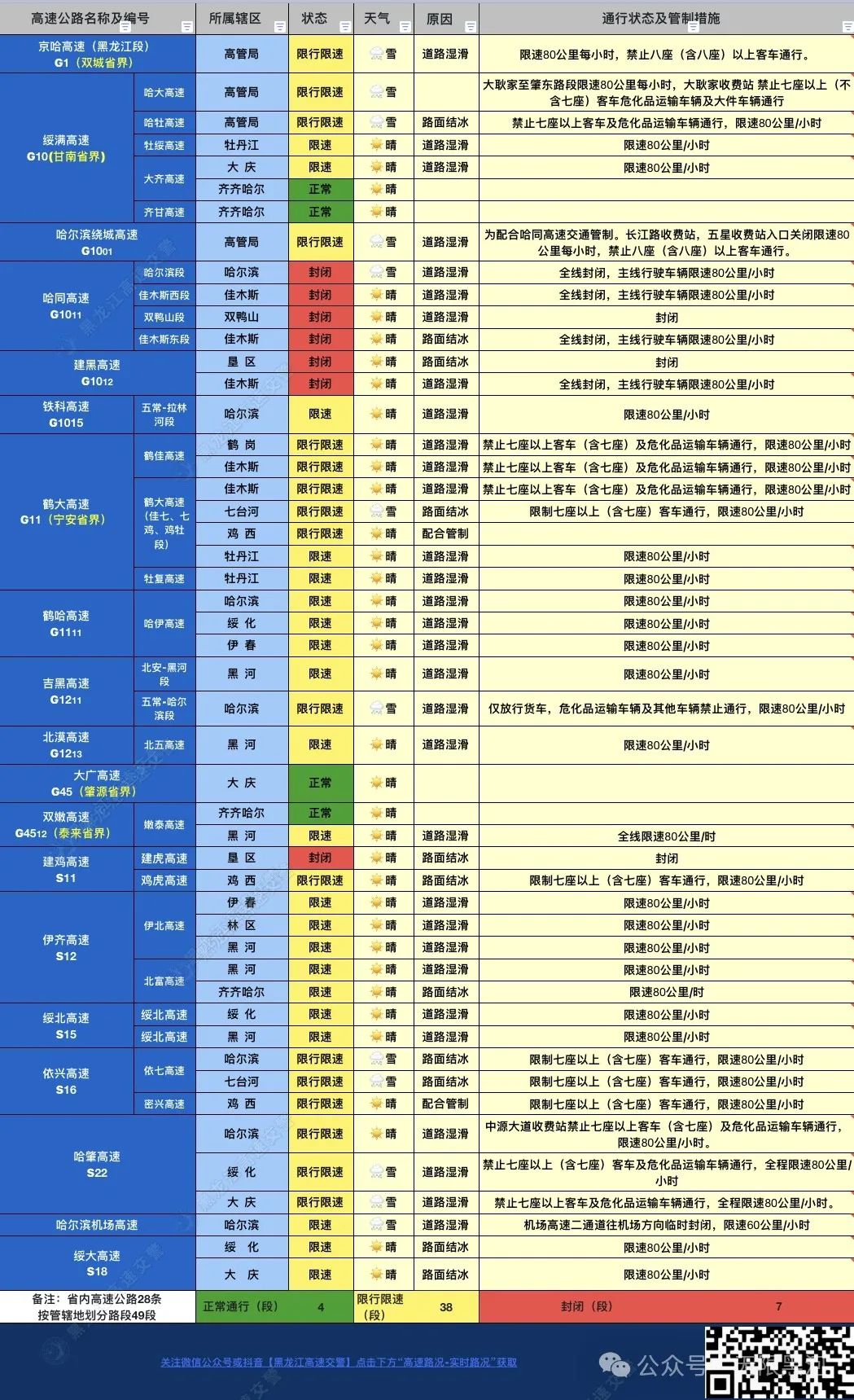 【限速21段】:牡丹高速(牡丹江段)、大齐高速(大庆段)、铁路高速(五常-拉林河段)、鹤大高速(牡丹江段)、牡丹复高速(牡丹江段)、哈伊高速(哈尔滨段)、绥化段哈伊高速公路、哈伊高速(伊春段)、吉黑高速(北安至黑河段)、北五高速(黑河段)、嫩泰高速(黑河段)、伊北高速(伊春段)、伊北高速(林区段)、伊北高速(黑河段)、北富高速(黑河段)、北富高速(齐齐哈尔段)、绥北高速(绥化段)、绥北高速(黑河段)、高速公路哈尔滨机场,绥大高速(绥化段)、21段绥大高速(大庆段)采取限速措施。