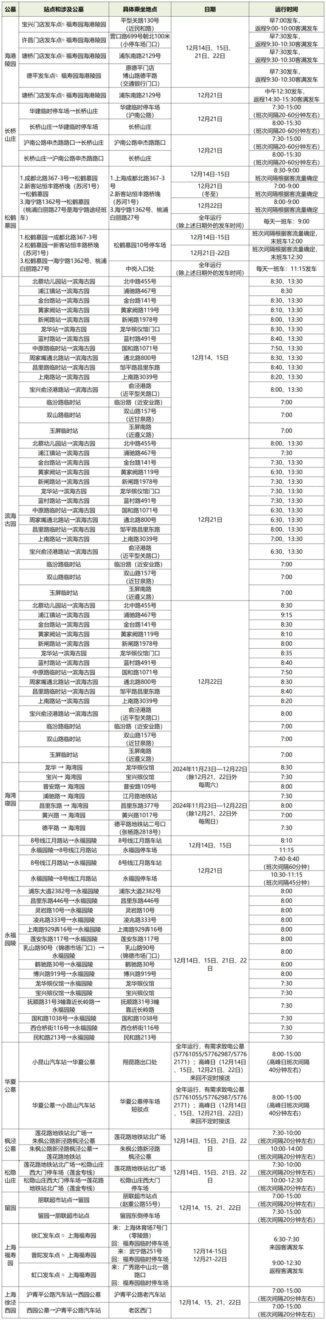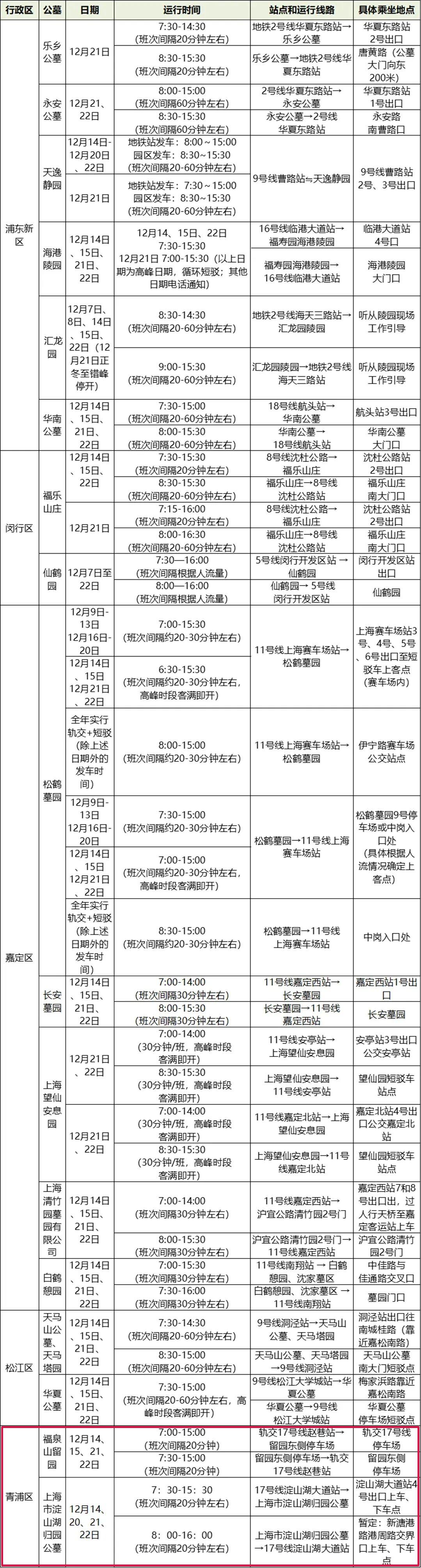备注:1、短驳车20~60分钟一班,高峰期客满即开,12月21日(正冬至)上午8:30~ 10:30、各轨交网站扫墓客流相对集中,建议市民错峰出行;2、如果公众对上述信息有疑问,可以直接咨询相关墓地。