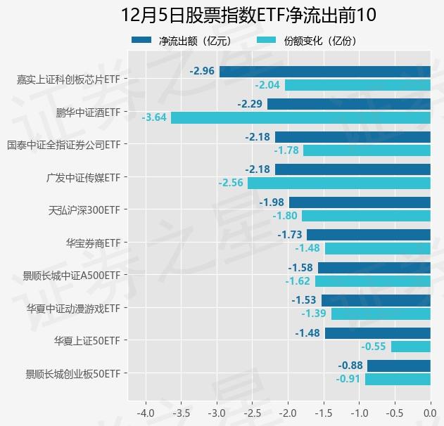 当天有 226 只股票指数 ETF 资金净流出,其中嘉实上证科技创新板芯片净流出排名第一。 ETF(588200),份额下降 2.04 一亿份,净流出额为 2.96 亿元。