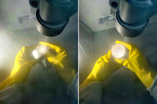 △左 装水用明火烤,不变色; 无水空烧,变色但有晶体保留。