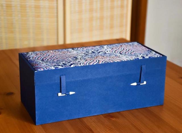 茶器都由蓝色锦盒包装,礼盒上有中国传统图案海水江崖纹。