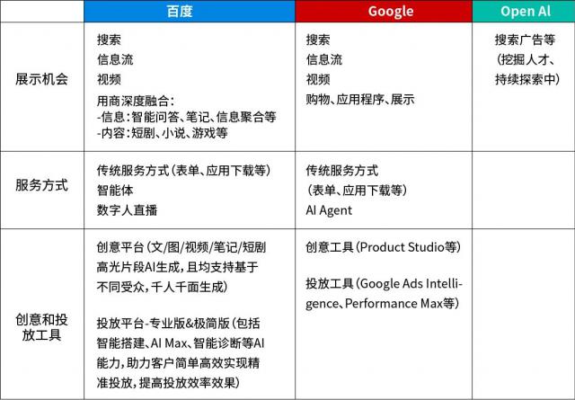 由于对 AI 不同于技术和应用理解,生态中的玩家现在处于两种状态。以便 Google 领先的营销平台,侧重于将大模型技术渗透到营销的每一个环节,推动创意制作、广告营销全过程的自动化。Open AI 也在探索在 ChatGPT 在搜索答案中植入广告。