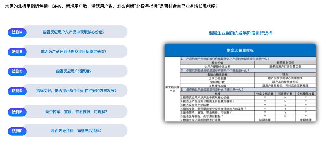 GMV通常是北极星指标。、增加用户数量和活跃用户数量。业务中拆解的方法有很多,主要看你承担了企业的业务指标。当然,北极星指数一般都有一些替代方案,也可以参考左图中的一些方法。