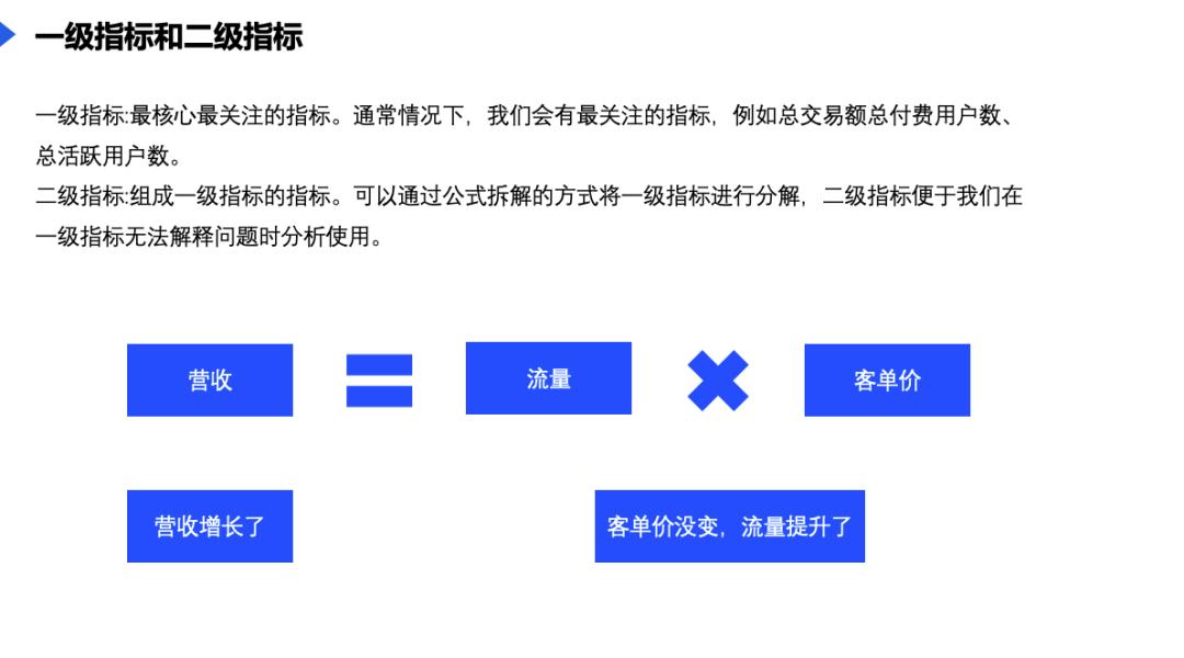 在运营中,我们还需要关注业务指标的拆解,营收=流量*客户数量。如果业务的一级指标是营收,从业务目标的拆解来看,二级指标是流量;如果企业的一级指标是流量,流量=广告曝光*点击量;那么二级指标可以是点击量;这需要根据业务属性进行拆解。每个行业都有不同的业务指标。首先,整理你自己行业的业务指标。接着进行指标拆解。