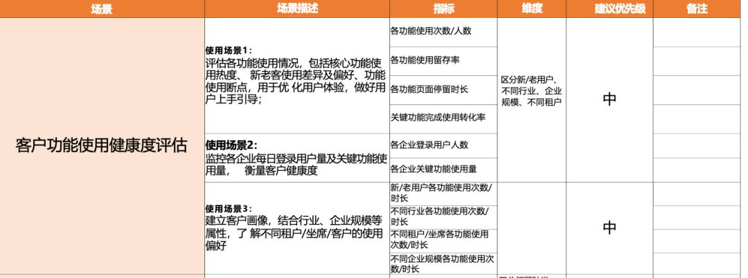 第三,这些指标可以作为评估用户健康程度的指标,根据不同用户群体、不同行业使用主要功能的次数和频繁使用功能。
