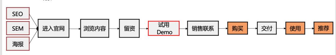 如上图所示,从第一步接触到客户完成核心业务指标,每个人都可以模拟客户的操作。从流量到客户的转换过程。第一步:客户通过搜索关键词在网上看到广告,然后点击广告;第二步:客户来到网站官网,看了公司的介绍,然后觉得商品还可以,然后留下资金或者注册;第三步:客户注册后,企业提供产品使用版本,让客户登录检测产品功能,随时联系销售。事实上,第三步还可以拆解用户的行为路径,用户每天登录的数据,功能点的点击数据,都可以作为对用户行为数据的统计。