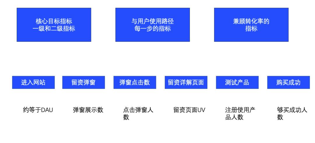 但是,业务目标无法进行日常衡量,必须进一步转换业务指标,转化为能衡量用户行为的指标。
