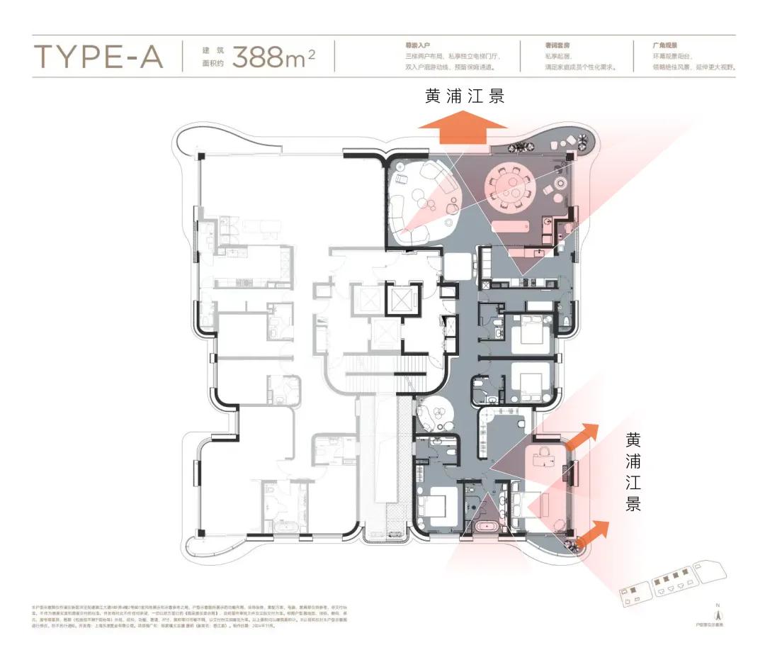该项目推出的建筑面积约为278㎡、388㎡一线江景豪宅,户型设计也是从居民的生活经历来思考的,比如388㎡在户型中,建成了约270°全景舱厅,有着无敌的采光和沉浸式的江景感。