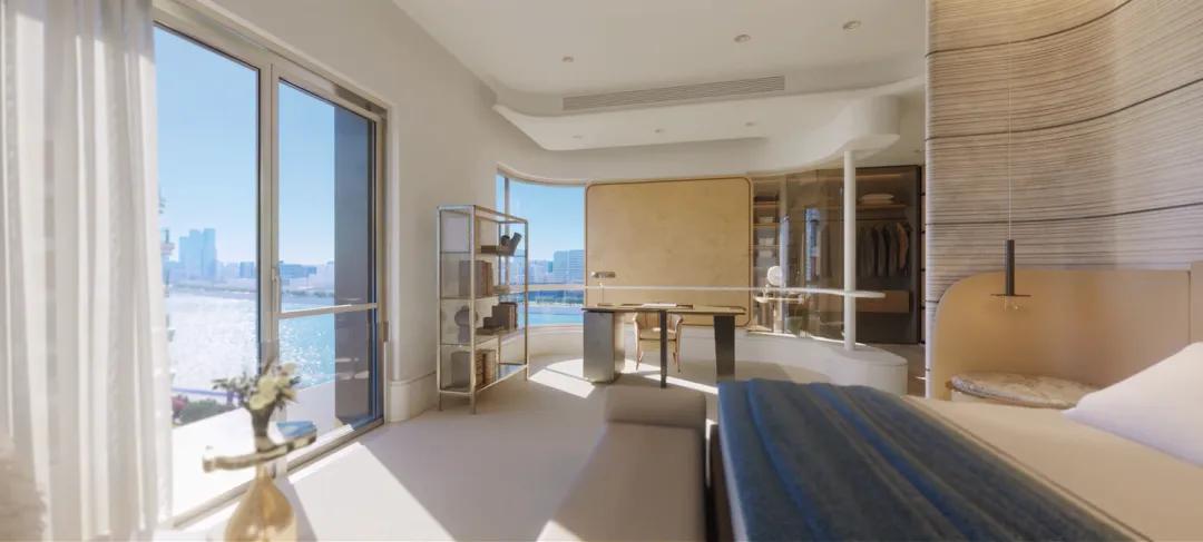 事实上,这个项目在主卧室里打造了两个窗户,可以看到一个窗户也做了弧形设计,加上阳台的弧形设计,这类卧室也有270间°采光面,空间透明度特别强,最后还能欣赏到江景。
