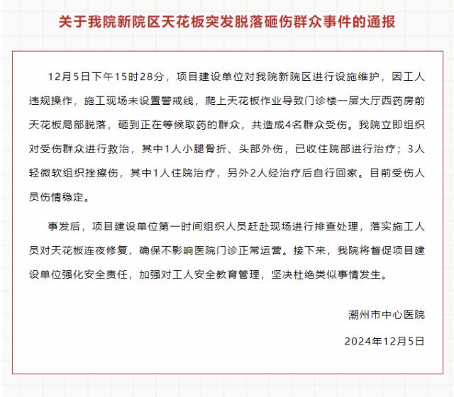 5 潮州市中心医院于日深夜发布事件通知。报告显示,12 月 5 日 15 时 28 分,项目建设单位对医院新院区进行设施维护。由于工人的违规行为,施工现场没有设置警戒线。爬上天花板,导致门诊楼一楼西药房前天花板局部脱落,砸到正在等药的人,造成 4 著名的群众受伤。