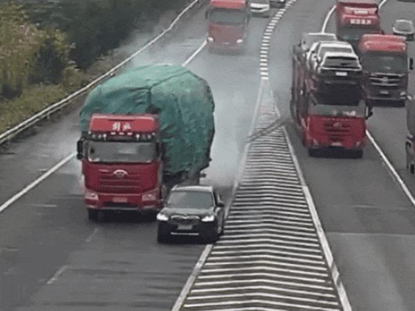 汽车高速错过路口随意变道。 大型卡车刹车都踩烟了。