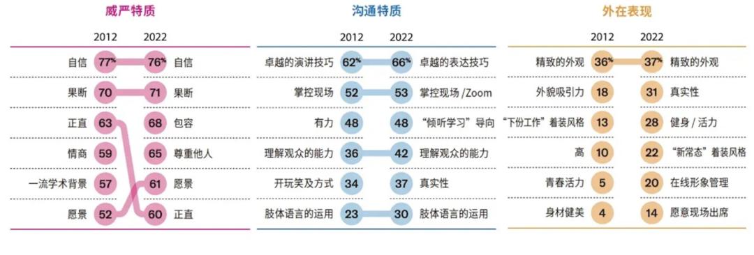 具体表现是高管最不重要的特点,但从2012年到2022年,这是最大的变化。10年前,研究对象不注重真实性,但现在它受到了新的高度赞扬。如今,高管要想成为领导者,就必须展示自己的本质,而不是模仿一些过时的理想方法。