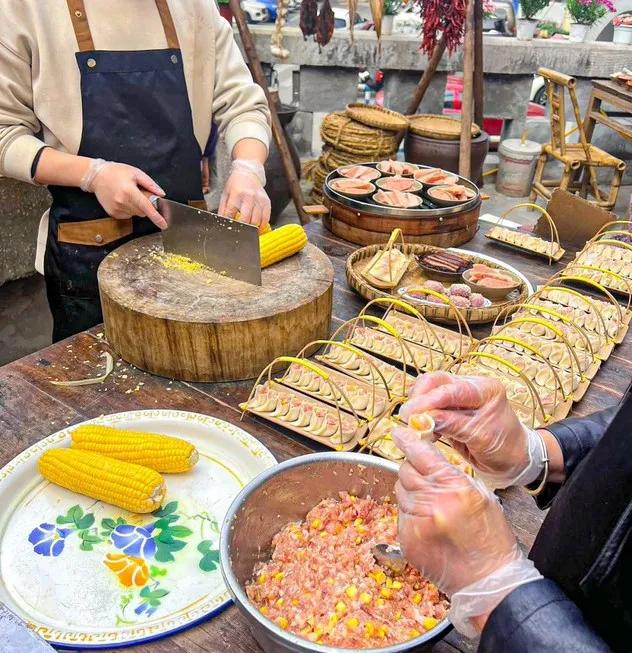 顾客们正在看着,那里一声“起”,大笼子掀开,整好的包子、土豆、蒸菜等物品,立刻出现在顾客的手机画面中。