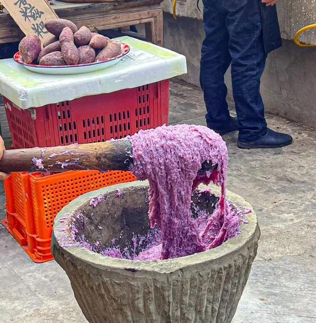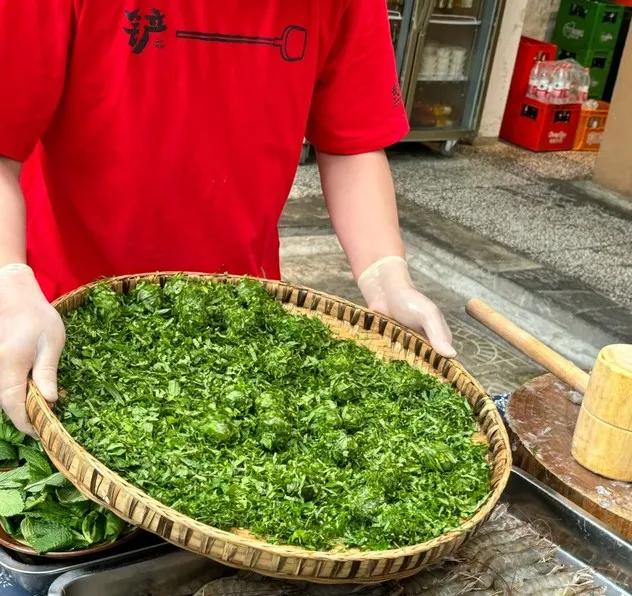 一个阿姨专心磨小磨,白嫩的豆浆从磨里流出来;另一个阿姨把挂着面糊的茄子条放在油锅里炸。油炸成品,黄橙色,金黄色,令人垂涎。还有一个阿姨在“滚虾滑”——虾滑,放在装满薄荷叶的竹簸箕里,摇晃簸箕,虾滑的时候贴上薄荷叶,然后放在盘子里。