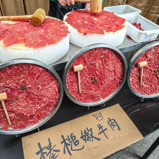 刀匠很大的厨师在一旁安静地切着牛肉,“牛肉摊”里挂着深红色的牛肉和新鲜的毛肚,以示不添加,不调养。