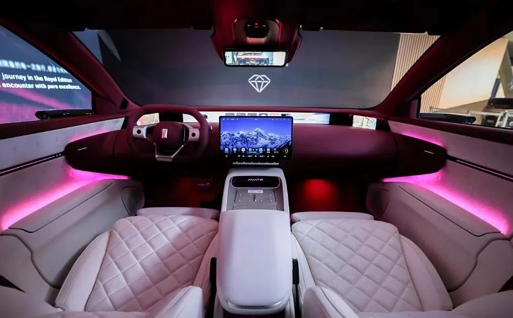 参照阿维塔12上的远端屏幕,是一种紧贴风挡下缘的实体长屏幕,由于位置较高,可以起到抬头显示的作用。