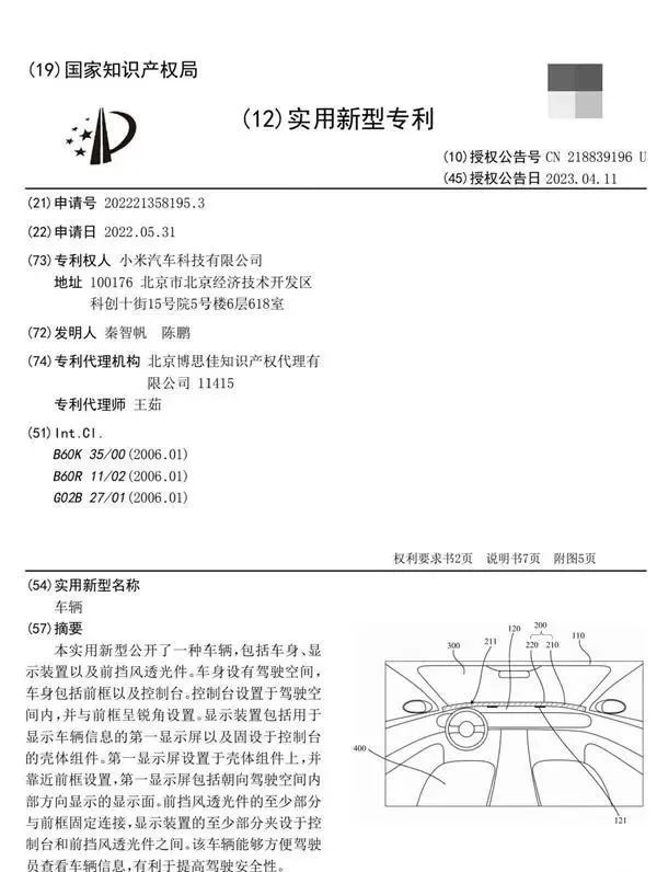 小米汽车科技有限公司于去年四月申请并获得“车辆”相关专利授权。