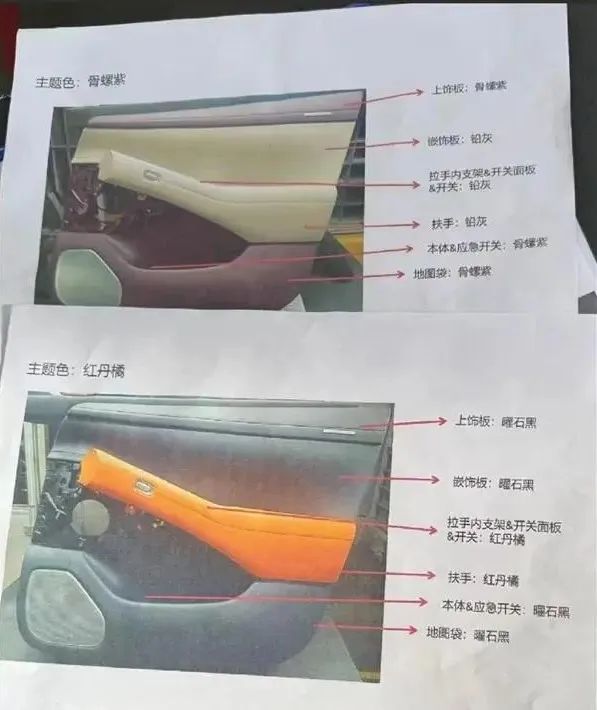 此外,最近网上曝光了一些疑似小米SUV门板的信息,至少有两种风格,包括骨螺紫和红丹橙。门把手上有一个按键开关,储物格前面有一个脚踏式紧急门把手。