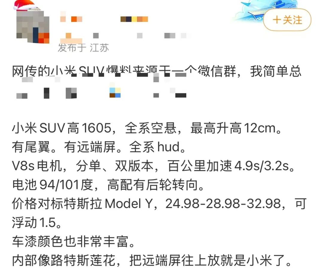 但是不要上头,看看就知道了。这是网友猜测的价格。但说实话,如果小米SUV真的使用后轮转向、全景HUD、零百加速3.2s,价格可以达到24.98万元,那么肯定会诞生另一个爆款。