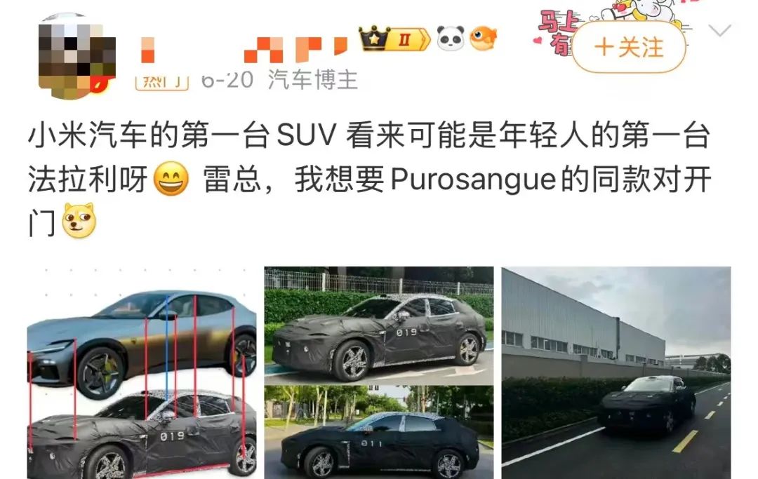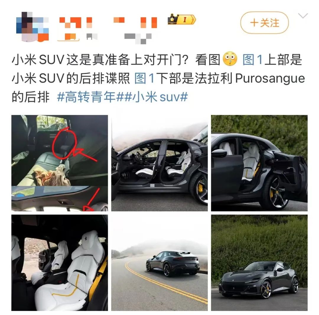 就连后面的汽车博主也晒出了所谓的小米SUV后排谍照和法拉利Purosangue后排的对比,并惊讶地说:“小米SUV这是真的准备开门了吗?”