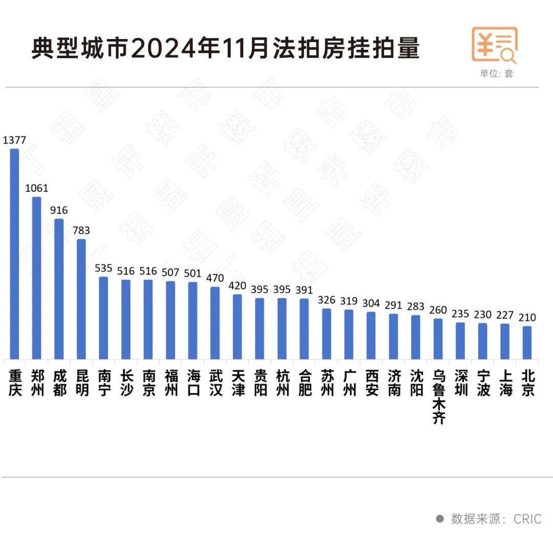 重庆单月挂拍规模最大的是重庆。,11月,法国拍卖行挂拍数量达到1377套,其次是郑州,挂拍数量达到1061套。其他城市挂拍规模不足1000套,其中成都新增挂拍数量超过900套。