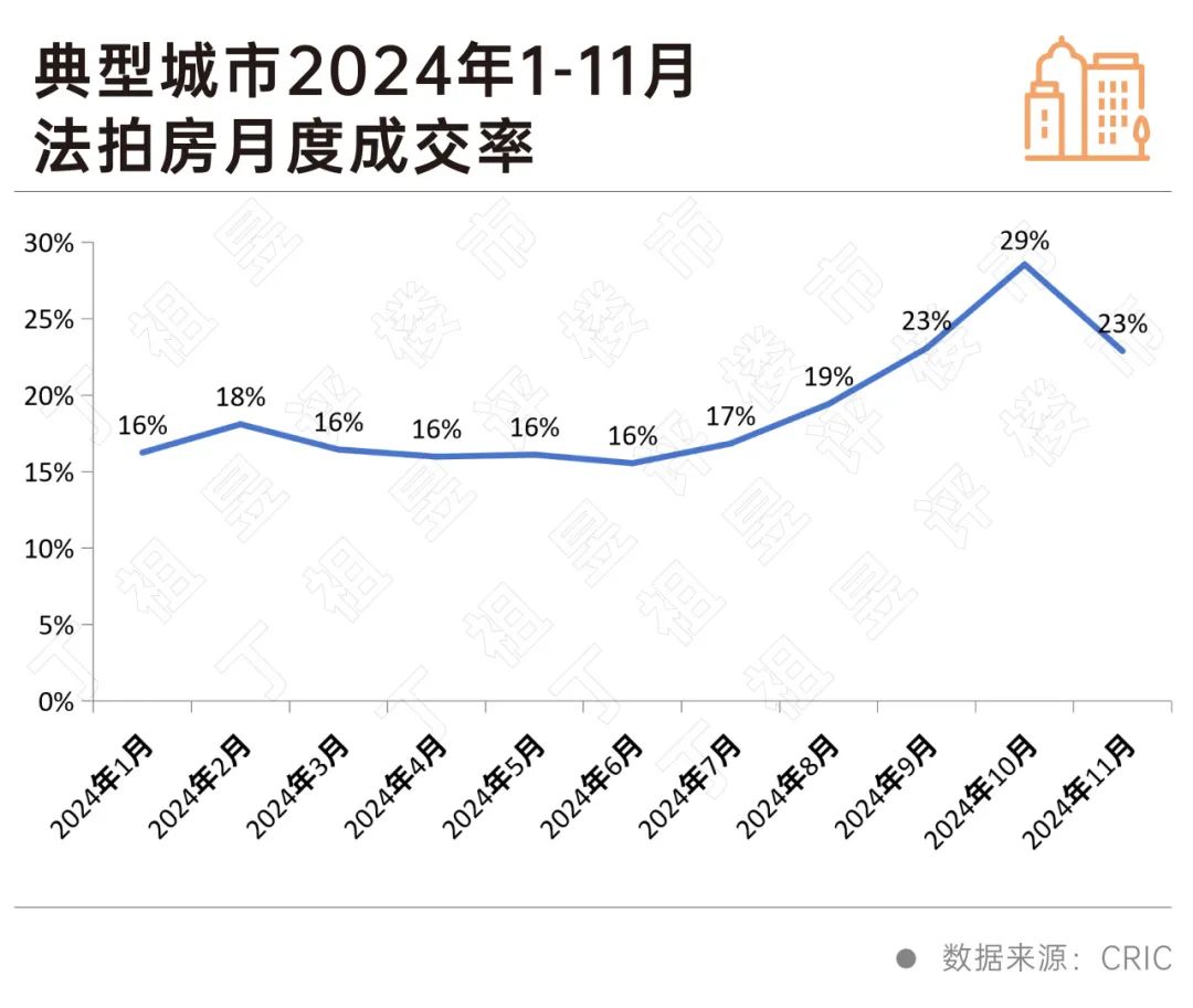 此外,法拍房供应量增加,成交量略有增加,法拍房成交率有所下降。根据CRIC取样调查数据,11月法拍房成交率为23%,较上月下降6%。%。