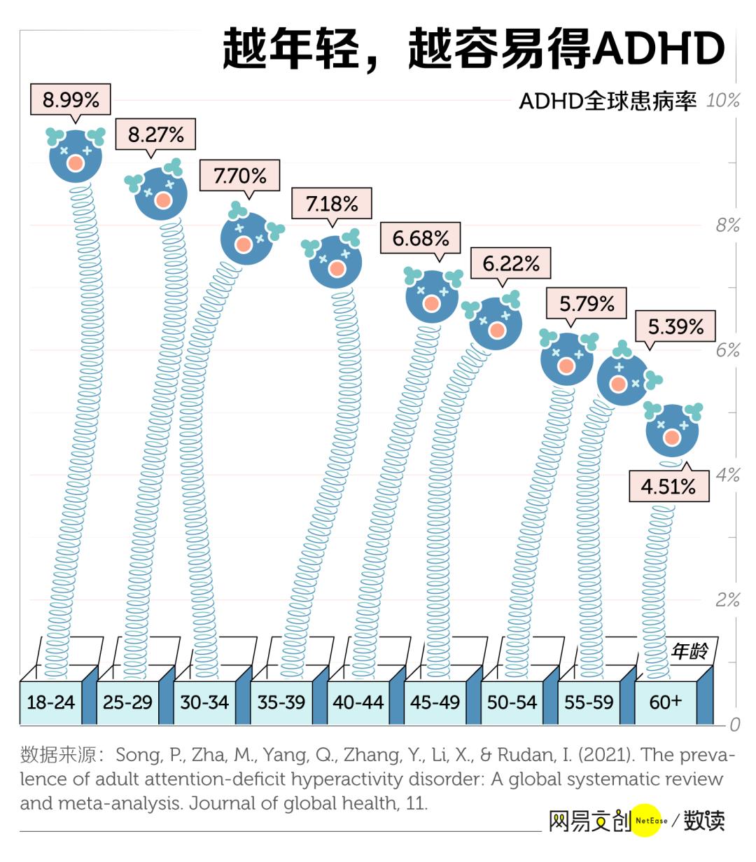 这是一种神经精神疾病,ADHD 从来没有达到人均诊断的程度,但是它的发病率并不低。全球系统综述和汇聚分析显示,成人 ADHD 现患率约为 6.76% [4]。与老年人相比,年轻人更容易诊断。 ADHD。在成人中,18-24 岁 ADHD 发病率最高,达到 8.99% [4]。